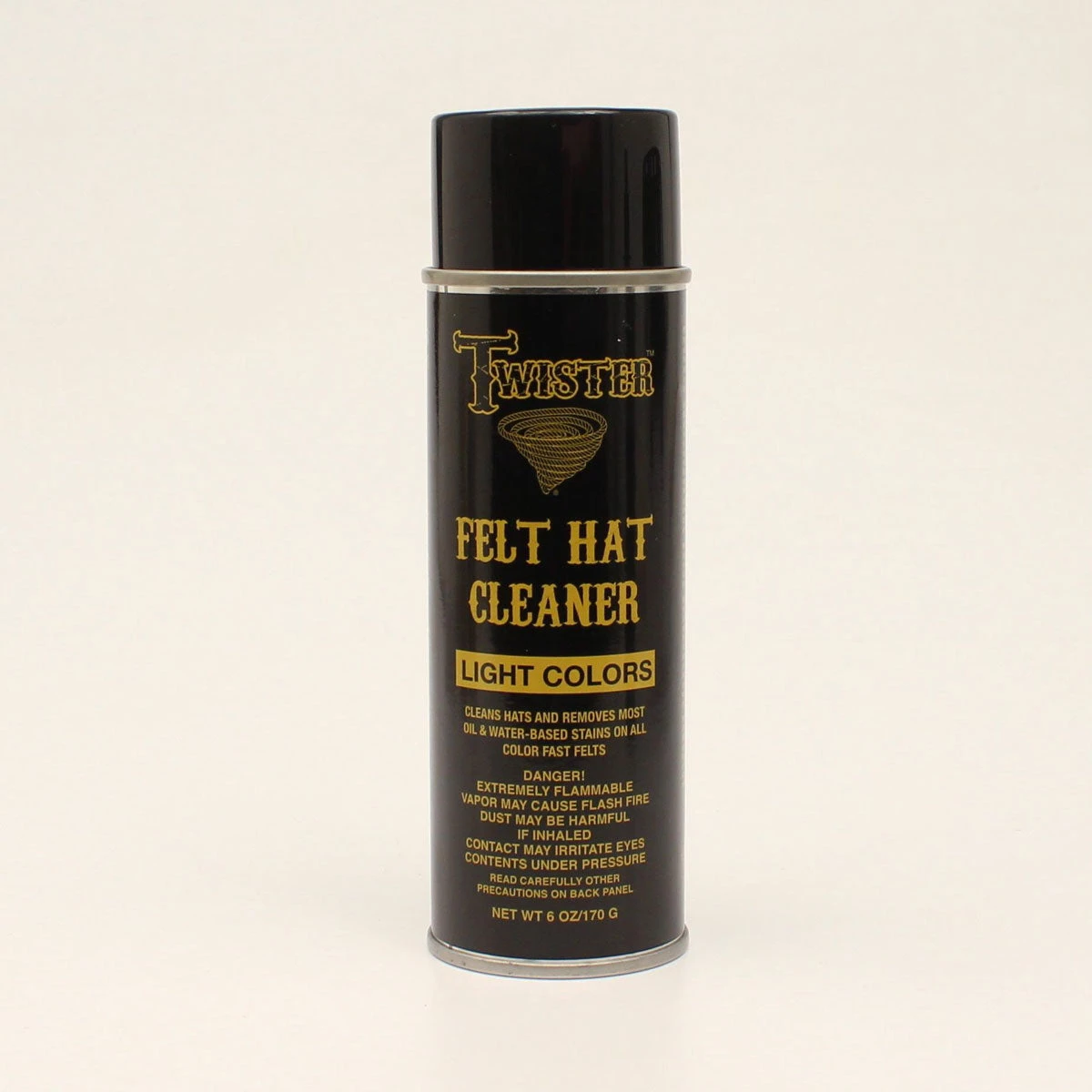 Twister Felt Hat Cleaner by M & F Western Products cleans hats and removes most oil and water based stains on color-fast felts and fabrics. This formula is specifically designed for use on light colored felts hats and other fabrics. 6 oz. Proudly made in USA.