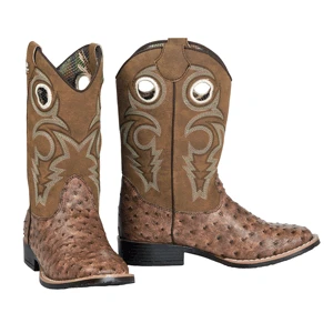 Your little cowboy will be all set to work the ranch with these DBL Barrel boots by M&F Western Products. These great boots have multi colored stitching on the shaft and a faux ostrich print design on the bottom. He will love how comfortable they are, and that they keep his feet dry for all day play with the moisture management lining. The boots are created with top quality man-made materials with superior attention to detail. And mom will like that they have a non marking outsole.