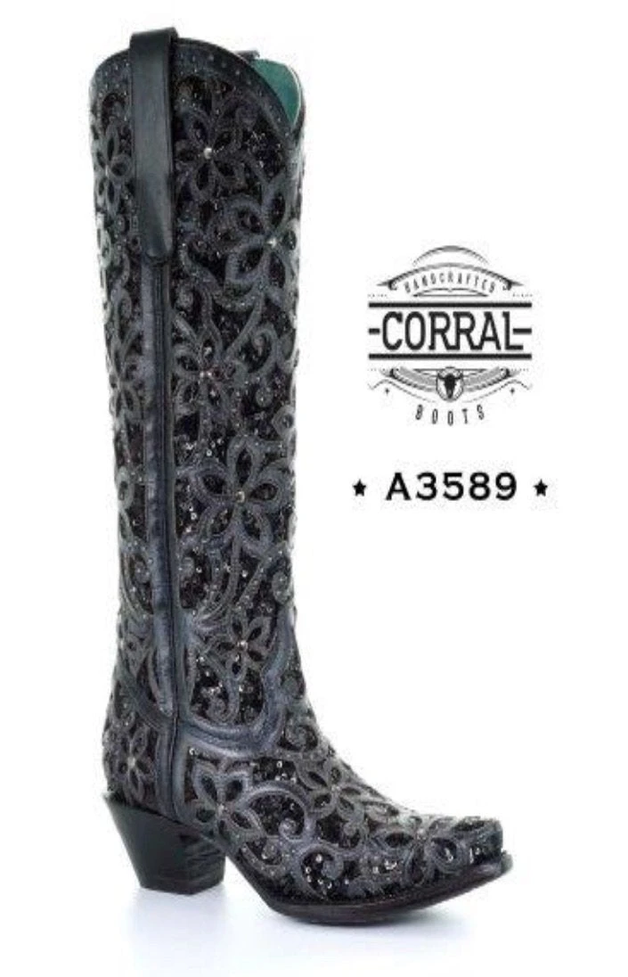 A3589 Corral Boots LD BLACK FULL INLAY & STUDS