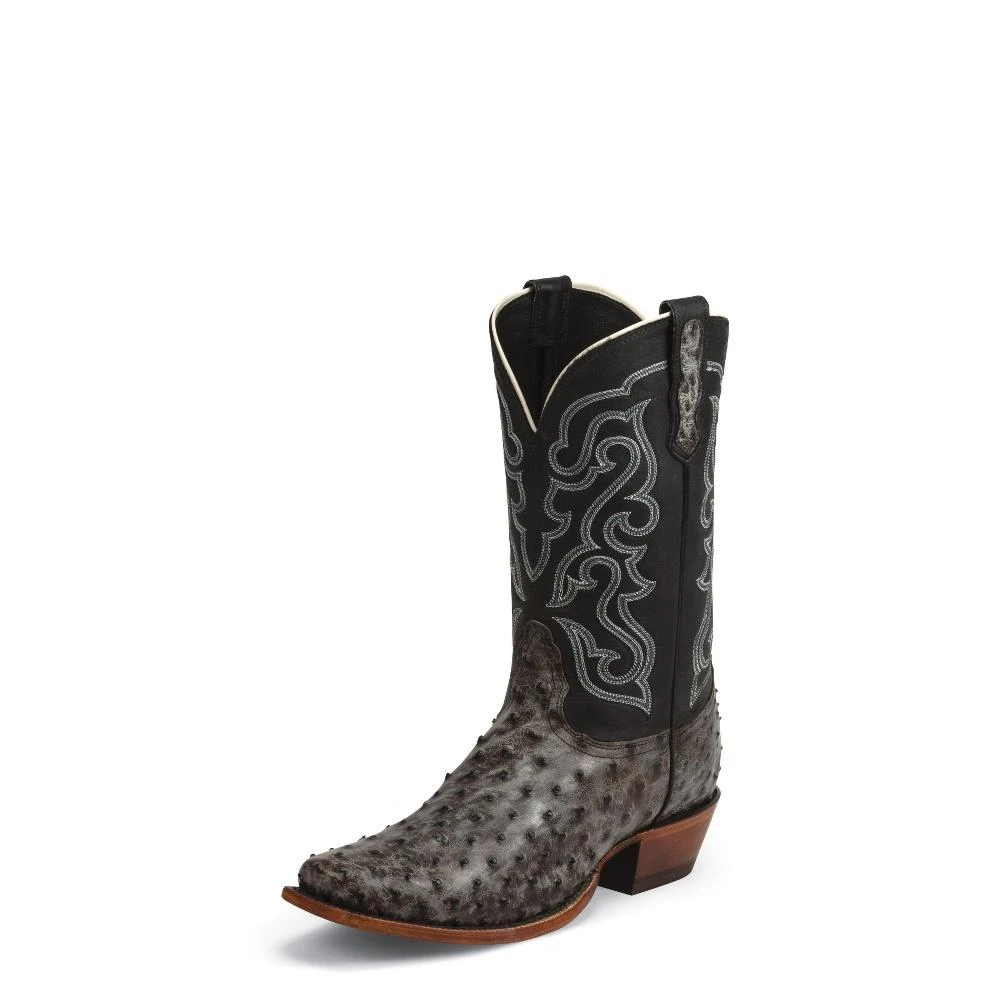 Style#:MD6514 Description:The Bronco Nicotine Full Quill 11-inch tall men’s Premium Collection cowboy boot features a smooth black leather upper with a bold silver stitch pattern. The charcoal and gray full quill ostrich foot is distressed for a lived in look and sports a half moon toe, 3/4 welt construction, and 1 1/2″ underslung heel. Its cushioned insole provides lasting comfort in and out of the saddle. This style is proudly Made in the USA with global parts. Upper:11″ VEGAS Foot:NICOTINE TUMBLED FQ OSTRICH Toe:L Toe, Nocona Half Moon  Heel:03 Heel, 1 1/2″ Height Underslung  Insole:CUSHION Outsole:LEATHERÂ