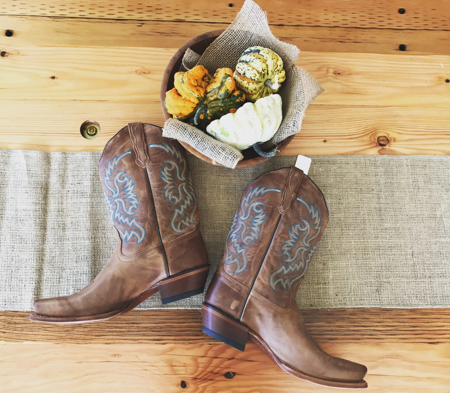- The Bluebonnet Tan is an 11-inch tall Women’s fashion boot with vintage class. The distressed golden brown leather exterior is embellished by a light turquoise and cream stitch pattern along the upper. The narrow square toe and elevated heel add an edge and the scalloped collar provides a feminine touch. Its cushioned insole guarantees lasting comfort and support in and out of the saddle.Â